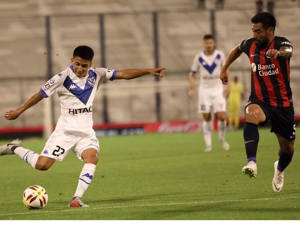 La joya. Thiago Almada, delantero de Vélez de apenas 17 años, remate ante la marca de Ariel Rojas, de San Lorenzo. En Liniers, no se sacaron diferencias.