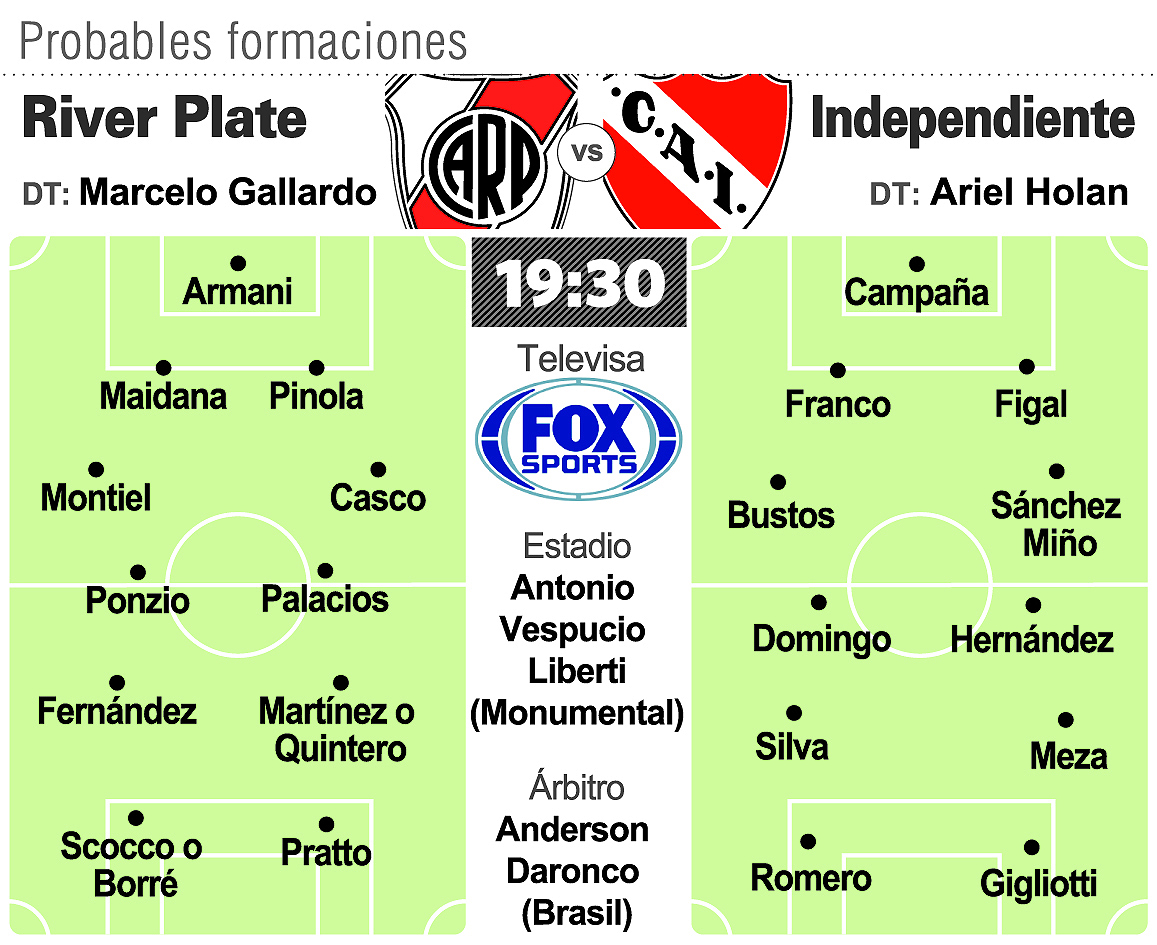 En caso de no jugar el ex Huracán, su lugar sería ocupado por el colombiano Juan Fernando Quintero, mientras que la dupla ofensiva integrada por Rafael Santos Borré y Lucas Pratto no sufriría modificaciones pese al buen momento que atraviesa Ignacio Scocco.