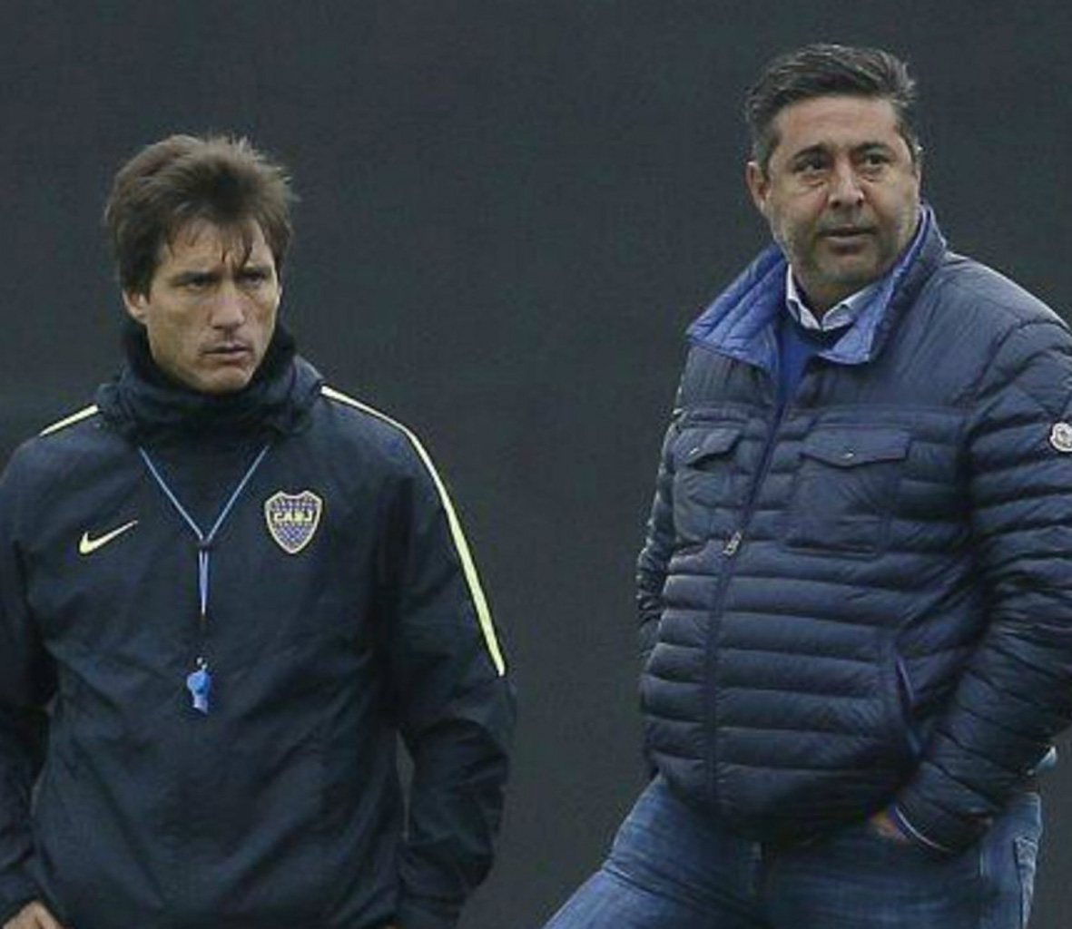 En la mira. El entrenador de Boca, Guillermo Barros Schelotto, y el presidente del club, Daniel Angelici, tuvieron ayer una charla luego de la eliminación por Copa Argentina.