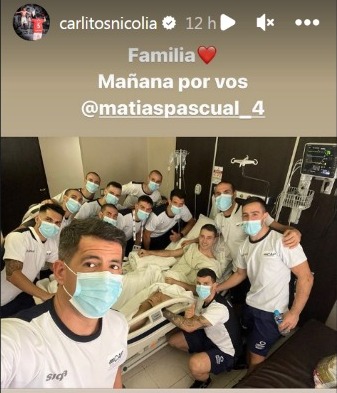 Carlos Nicolía compartió la imagen en su cuenta de Instagram con un fuerte mensaje que demuestra el sentimiento de compañerismo del plantel. "Familia. Mañana por vos", escribió junto a los jugadores con Matías que se encuentra internado tras la fractura de tibia y peroné cerrada, en unión de tercio medio con tercio inferior.