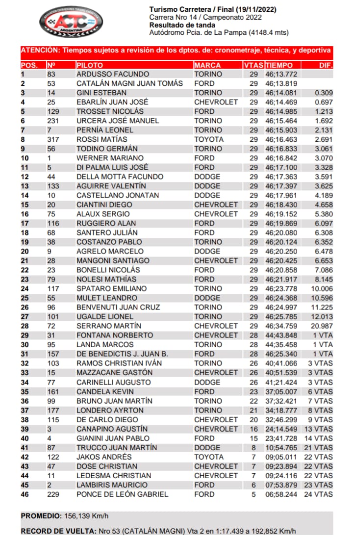 El paso de la máxima por suelo pampeano entregó una de las mejores competencias de la temporada 2022 donde el Torino de Facundo Ardusso consiguió la victoria en una gran tarea y además clasificó como uno de los 3 pilotos de último minuto que lucharán por ganar la Copa de Oro Rio Uruguay Seguros en la última cita de San Juan.