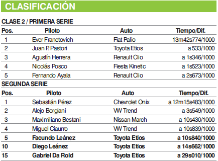 Las series de la Clase 2 fueron para Sebastián Pérez y Ever Franetovichi, quienes hoy largarán en primera fila la final. La prueba que ganó Franetovich lo tuvo liderando de punta a punta, incluso a pesar del ingreso del Auto de Seguridad. Sí hubo lucha, e intensa, del tercer puesto hacia atrás, especialmente el duelo que mantuvieron Posco y Herrera.