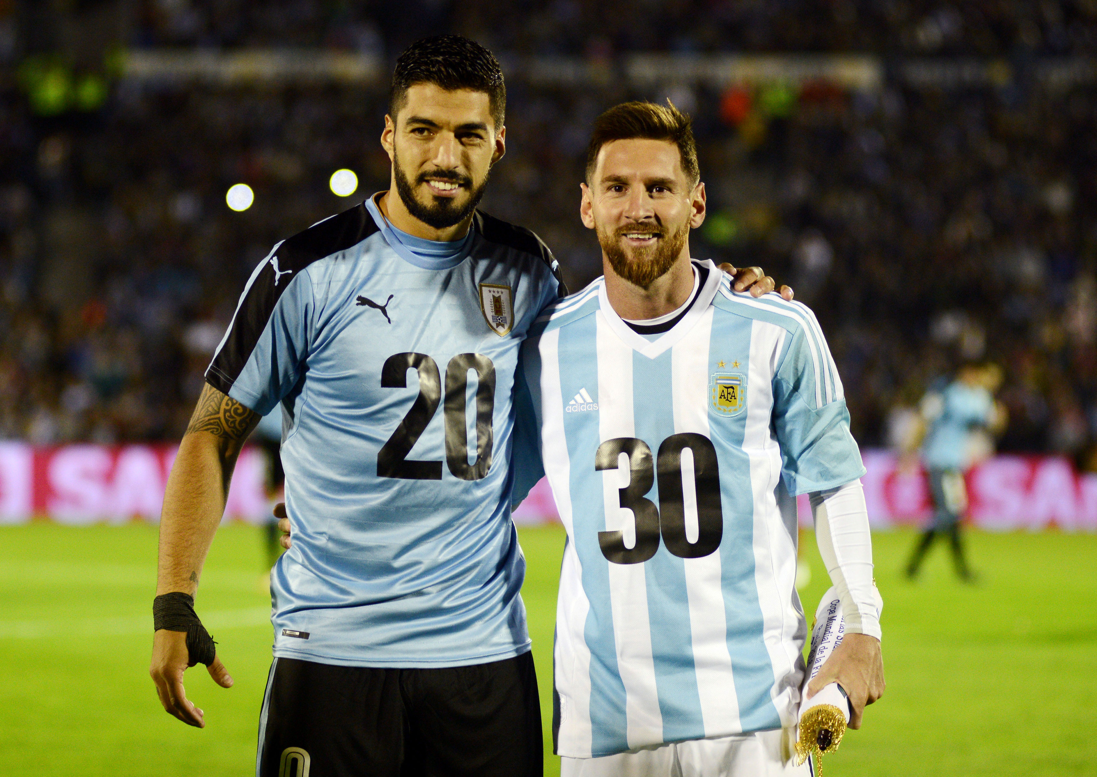 Amigos y socios. Luis Suárez y Lionel Messi se fotografiaron antes del clásico con las camisetas formando el año 2030.