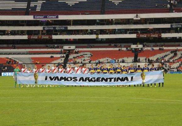 La ilusión mezcla colores. El superclásico argentino es una batalla de colores, cantos y color en las tribunas, siempre. En la Argentina o en México, donde se jugó el sábado y River festejó luego del 1-1 en el global y el 4-2 en los penales. Pero antes del partido, los dos equipos se juntaron y posaron con una bandera en celeste y blanco, con la inscripción “¡Vamos Argentina!”, junto a una imagen de la Copa del Mundo. Y nada menos que en el Azteca, donde Diego y compañía tocaron el cielo y levantaron el trofeo más deseado.