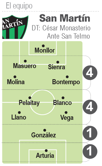 En lo futbolístico, Monasterio no confirmó ni sistema ni nombres pero respecto de lo que se vio en Córdoba por Copa Argentina, en defensa volvería la línea de 4 con Alejandro Molina y Leonel Bontempo como laterales, más la zaga de Abel Masuero y Agustín Sienra. En el medio, por los costados irán Manuel Llano y Alexis Vega, mientras que la dupla Pelaitay y Blanco es fija. Para la creación, indispensable la presencia de Sebastián González y el gran momento de Marcos Arturia como punta. Esa formación hoy asoma como la ideal de un San Martín que irá por el reencuentro con la victoria como local tras el empate sin goles con San Martín tucumano.