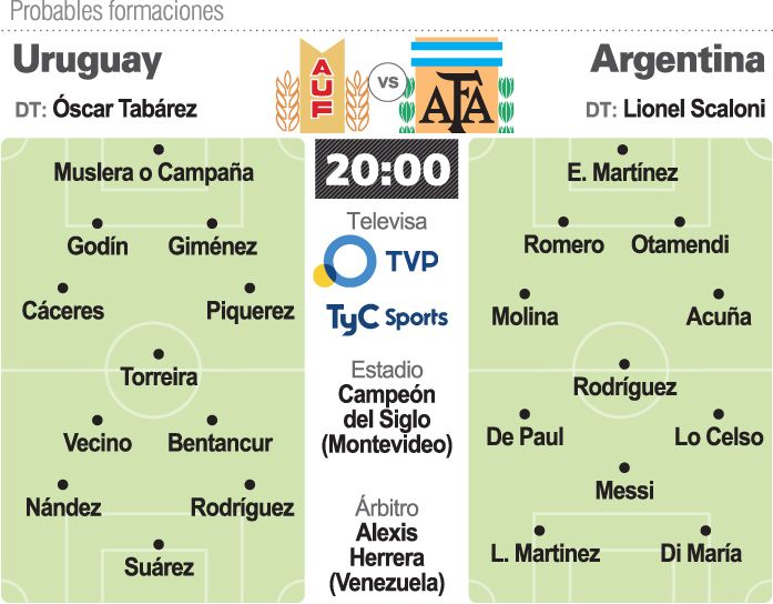 El seleccionado argentino, escolta en las Eliminatorias Sudamericanas, visitará hoy a Uruguay, ubicado en puesto de repechaje, con la intención de una victoria que lo acerque a la clasificación para el Mundial Catar 2022. El clásico rioplatense tendrá un escenario inédito: el estadio Campeón del Siglo del club Peñarol, en Montevideo, y se jugará desde las 20 con arbitraje del venezolano Alexis Herrera y transmisión de la TV Pública y TyC Sports.
