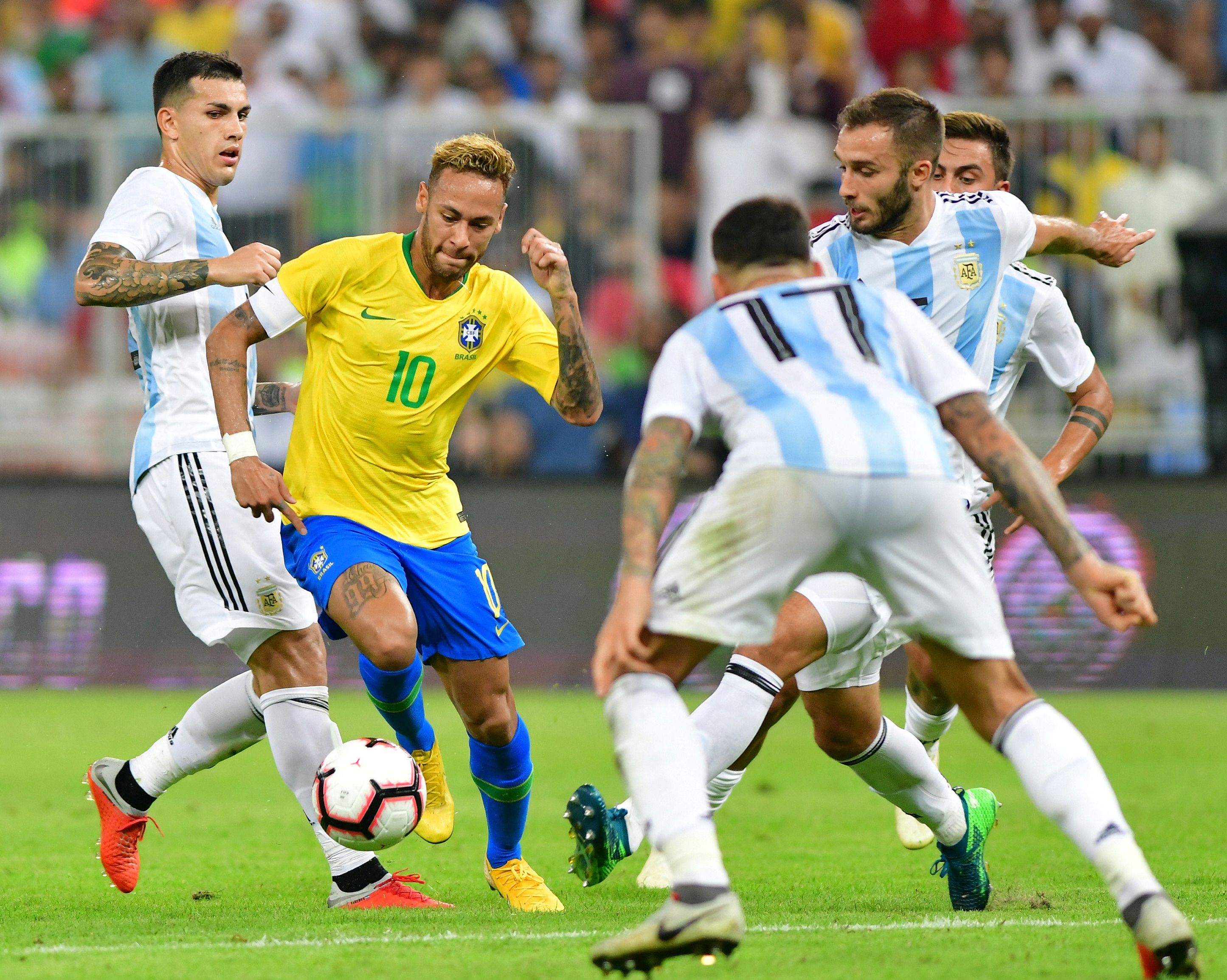 El conjunto brasileño dirigido por Tité comenzó mejor en los primeros minutos con Neymar activo por el sector izquierdo, pero bien controlado por el defensor de Racing Club, Renzo Saravia. Argentina fue entrando en el clima del encuentro y tuvo la primera ocasión de riesgo con un zurdazo de Giovani Lo Celso, a la altura de la medialuna, que se fue junto al palo izquierdo de Alisson. Argentina presionaba arriba y Brasil atacaba por ambos laterales, donde la defensa argentina mostraba algunas imprecisiones. Neymar, dolorido por un pisotón de Leandro Paredes -luego amonestado-, fue tomando protagonismo y comandando las acciones de peligro de la "verdeamarela".