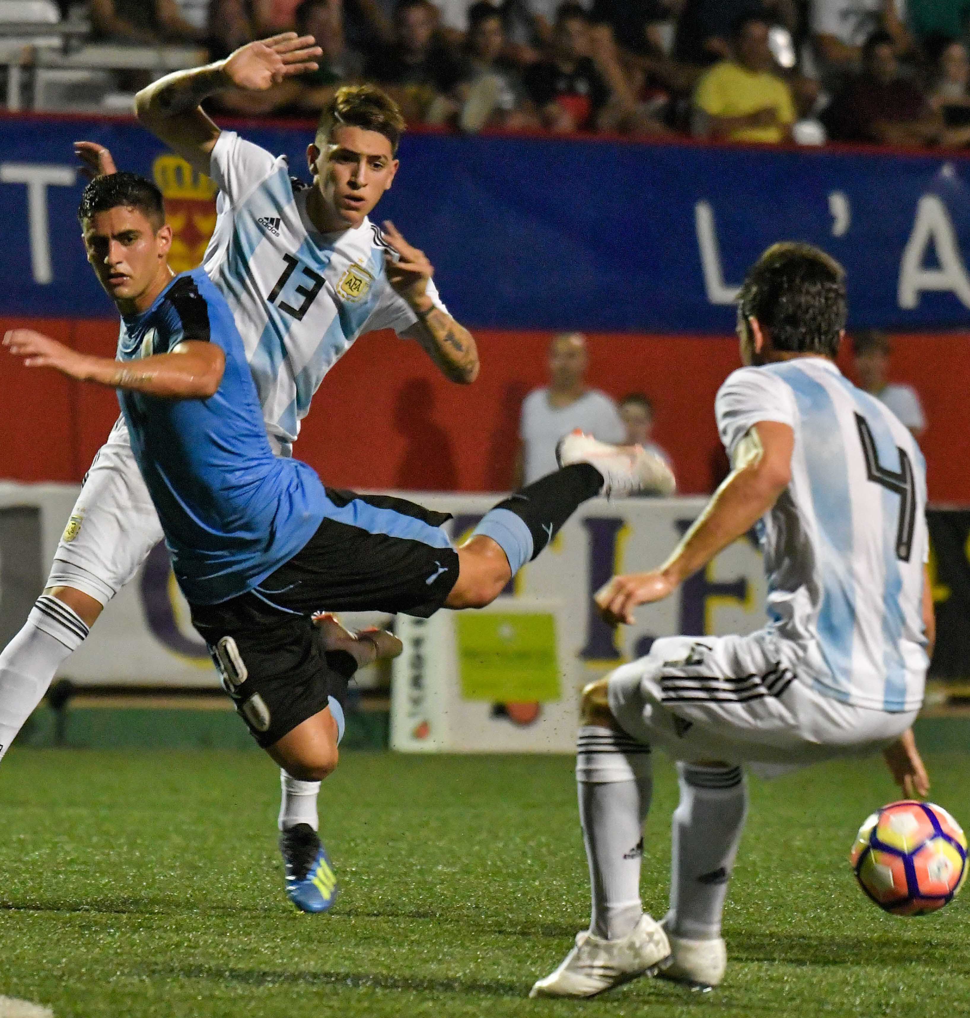 Le costó hacerse del balón a Argentina en la primera media hora de acción. Las características más proclives al manejo de sus mediocampistas hicieron padecer al equipo ante un conjunto charrúa aguerrido y más directo. De hecho, no logró elaborar oportunidades de marcar. Encima, a los 29" se fue expulsado Andrés Ayala tras un manotazo, cuando ya había recibido la amarilla. Recién en el minuto 40 tuvo su primera aproximación: Adolfo Gaich no llegó a conectar un cabezazo que buscó su participación. En la segunda parte, la dupla técnica buscó equilibrar el equipo con el ingreso de Nazareno Colombo por Gaich. Fortificó el fondo y Argentina se fue soltando de a poco. Maroni reventó el palo de tiro libre y hasta consiguió enhebrar alguna jugada combinada, con la trepada del lateral Elías Pereyra.