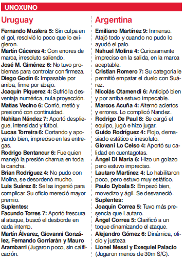 En el complemento, Uruguay repitió la apuesta y decidió presionar la salida de Argentina. Más ofensivo, con otro aire, la Celeste complicó ese arranque de un Argentina que no podía tener la pelota, que cometía errores en el sector de Guido Rodríguez y que no podía cambiar el trámite. La solidez de Martínez en el arco y la entrega ilimitada de De Paul en el medio alcanzaron para sostener el planteo de Argentina, que con cambios empezó a buscar otras respuestas. Adentro Joaquín Correa, adentro Gómez, también Angelito Correa pero sin la reacción que Scaloni necesitaba. Y claro, la gran carta estaba en el banco y con la 10. Era el momento de Messi como resolución de un partido que se iba complicando lentamente. Llegaron esos 15 minutos finales con el capitán en cancha y aguardando que Argentina tomara las riendas del clásico. Uruguay insistió con lo que tenía y a los 39" Álvarez tuvo la más clara de cabeza pero elevó su remate. Messi apareció en el descuento con un remate desviado, pero la historia ya estaba escrita. Argentina dio otro paso. No con el brillo de otros partidos, pero sólido en todo para sostener sus aspiraciones camino a un nuevo Mundial.