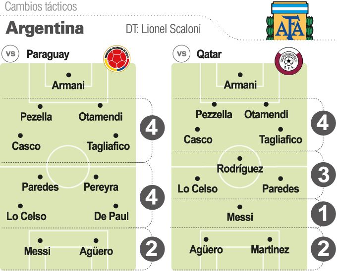 Del medio para adelante, empiezan las contramarchas. Volvería Guido Rodríguez, borrado ante Paraguay pero titular ante Colombia, para armar un medio con tres volantes teniendo a dos que no salen nunca: Lo Celso y Paredes. Habrá que ver si Scaloni consigue ese equilibrio que temió perder ante los guaraníes, justificando la salida de Lautaro Martínez. Con Rodríguez, la idea de un volante central neto parece estar asegurada pero sin olvidar que Qatar estará enfrente, la velocidad del mediocampo argentino es lo que preocupa. Será al golpe por golpe en el medio, pero ojo: sin olvidar que Qatar estará enfrente. Más arriba, estará Messi. Ese que puede jugar de todo, donde sea y con quien sea. Liberado, suelto pero no aislado. Así, Messi es Messi. Si no, rodeado, obligado a hacer todo hasta cortar el pasto y pintar la cancha, no. Imposible. Y claro, con la necesidad de goles encima, Scaloni le vendió el alma al diablo para terminar optando por el Kun Agüero junto a Lautaro Martínez. Una dupla impensada pero puesta en cancha porque la necesidad tiene cara de hereje. Las combinaciones tácticas del 4-4-2, el 4-2-3-1 y miles de combinaciones numéricas más ya no cuentan. Argentina necesita identidad. Simple, sencillito.