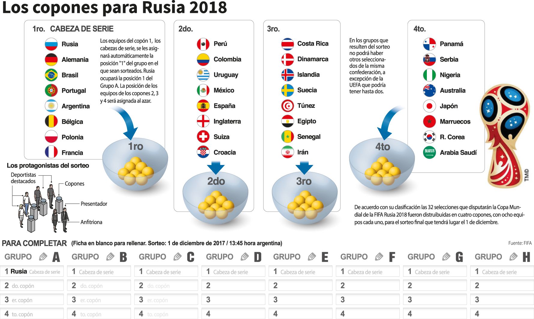 La diferencia respecto de un partido de este Mundial, que se extenderá desde el 14 de junio hasta el 15 de julio, es que cada una de las 32 “pelotitas” tendrá nombre propio, y se ubicará según su historia y linaje en cada uno de los cuatro bombos desde donde se irán armando las zonas.