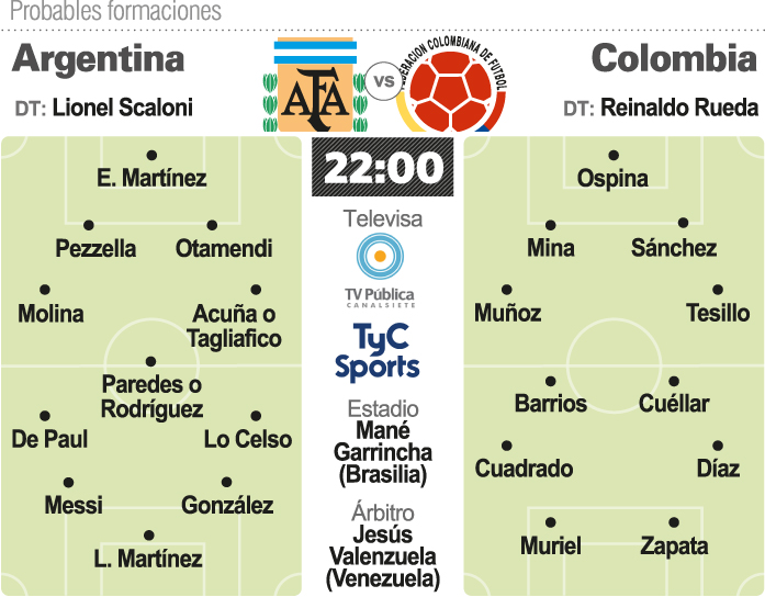 El seleccionado argentino, liderado por Lionel Messi, enfrentará hoy a Colombia en busca de la clasificación a la final de la Copa América de Brasil 2021. La segunda semifinal se disputará en el estadio Mané Garrincha de Brasilia desde las 22, con arbitraje del venezolano Jesús Valenzuela y será transmitida por la TV Pública, TyC Sports y DirecTV Sports.