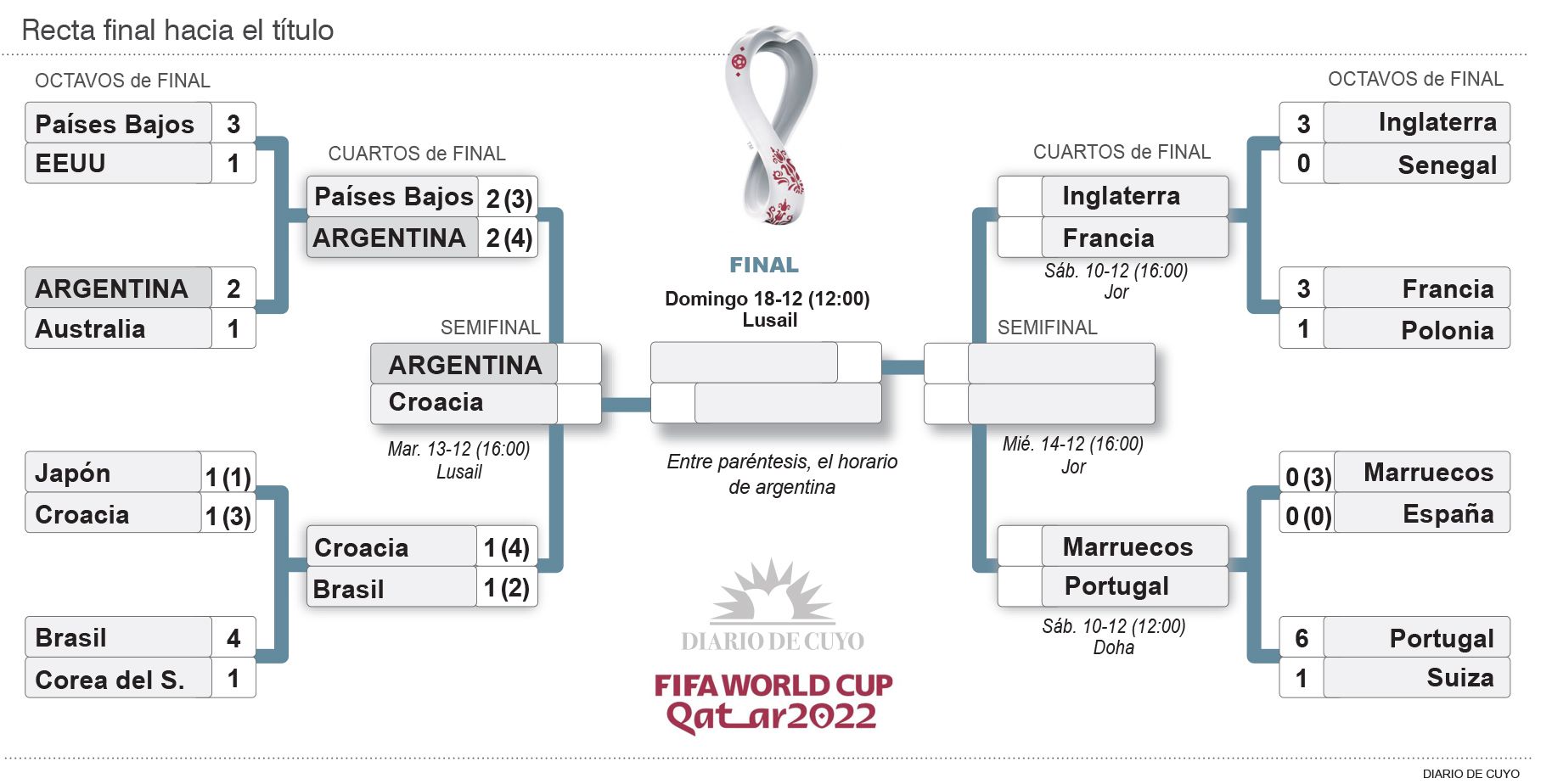 Argentina eliminó a Países Bajos por 4-3 en los penales y se clasificó a las semifinales del Mundial de Qatar 2022 en una sufrida definición que tuvo a Emiliano "Dibu" Martínez como héroe, al igual que Sergio "Chiquito" Romero ante el mismo rival en Brasil 2014. El arquero le tapó los dos primeros envíos al capitán neerlandés Virgil Van Dijk y a Steven Berghuis, lo que encaminó un pase de ronda sentenciado por Lautaro Martínez en la quinta y última ejecución. En los festejos de la clasificación, "Dibu" Martínez y Lionel Messi se cruzaron con el DT neerlandés Louis Van Gaal, que por segunda vez en su carrera soportó la frustración de una despedida por penales ante la "Albiceleste". La victoria en el período reglamentario parecía asegurada con tantos de Nahuel Molina (35m.PT) y Messi (28.ST), de penal, pero Países Bajos alcanzó un inesperado 2-2 con doblete del ingresado Wout Weghorst (38m.y 56m.ST), lo que forzó una prórroga de 30 minutos. Argentina jugará su quinta semifinal mundialista el próximo martes ante Croacia, desde las 16 (hora argentina) en Lusail, colmado este viernes con más de 80 mil fanáticos que estallaron de júbilo tras el angustiante desenlace. Una clasificación marcada por la angustia pero legitimada por la propuesta del equipo de Messi que ahora va por mucho más.