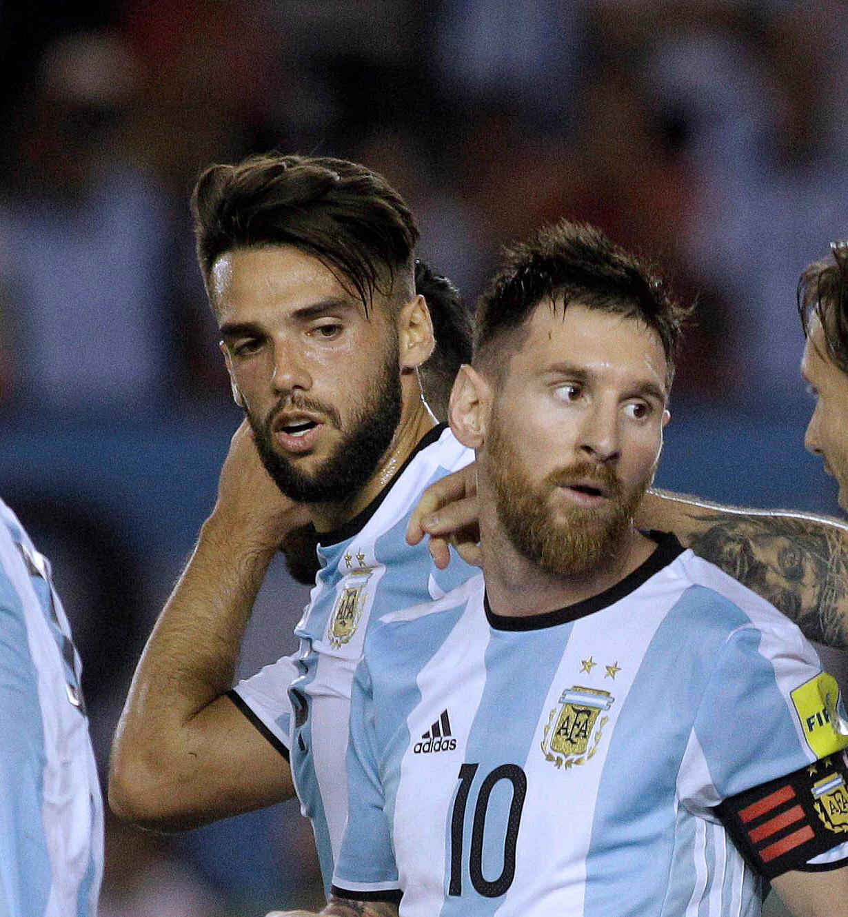 El sanjuanino Emmanuel Mas (en la foto con Messi) no tuvo una gran noche. A punto tal que sólo jugó un tiempo, el primero, porque el técnico Bauza lo reemplazó para el complemento por un golpe que sufrió promediando la primera etapa de su propio compañero, el arquero Sergio Romero.