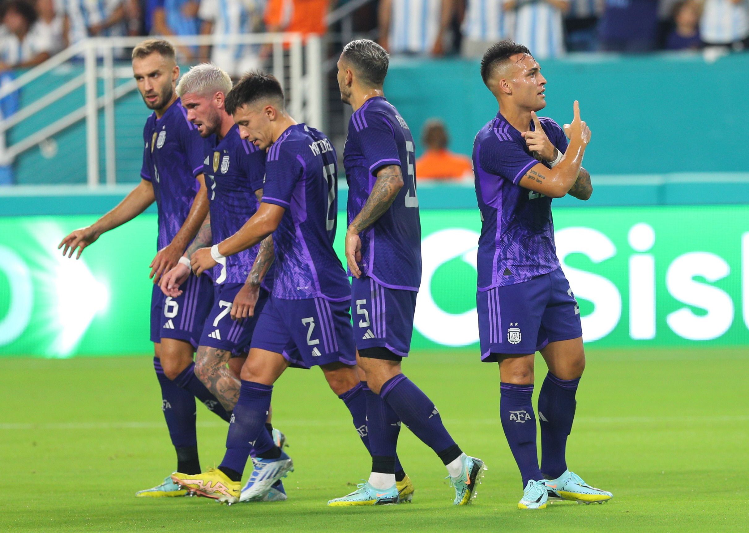 Lautaro Martínez (15m.PT) y Lionel Messi en dos ocasiones, primero de penal (46m.PT) y luego de emboquillada sobre el arquero (23m.ST), marcaron los goles del equipo argentino, que estrenó la camiseta violeta inspirada en la diversidad.