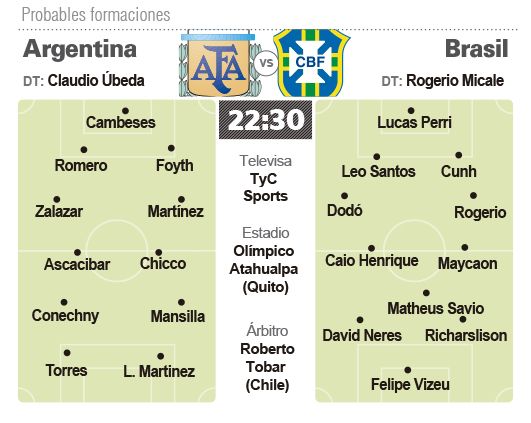 El clásico sudamericano, aunque esta vez a nivel juveniles, se jugará esta noche desde las 22.30 (hora de la Argentina) en el estadio “Olímpico Atahualpa”, de la ciudad de Quito, con transmisión de la señal de cable TyC Sports.