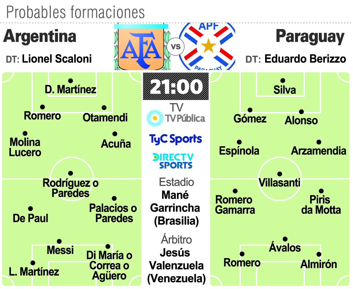 De seguro, Argentina tendrá dos cambios para cuidar el estado físico de dos mediocampistas que terminaron tocados tras el partido con Uruguay: Giovani Lo Celso, con una inflamación en el tobillo izquierdo, y Nicolás González, víctima de un golpe. Sus reemplazantes saldrán entre Exequiel Palacios o Leandro Paredes para el primero; Ángel Di María, Ángel Correa o Sergio "Kun" Agüero para el segundo.