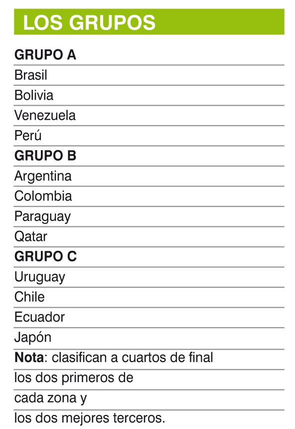 La zona A tendrá al anfitrión Brasil como cabeza de serie y sus tres rivales serán Bolivia, Venezuela y Perú, a los que enfrentará en esa secuencia, lo mismo que Uruguay lo hará en el Grupo C con Ecuador, el otro invitado, Japón, y Chile.