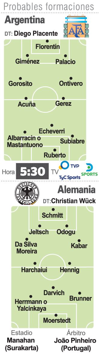 El seleccionado argentino Sub-17 enfrentará hoy a Alemania por un histórico lugar en la final del Mundial de la categoría que se disputa en Indonesia. La primera semifinal se jugará desde las 5.30 de nuestro país en el estadio Manahan de Surakarta, con arbitraje del portugués Joao Pinheiro y será transmitido por la TV Pública, TyC Sports y DSports. Luego, a las 9.30 y en el mismo escenario, Francia enfrentará a Mali por el otro pasaje al partido decisivo.
