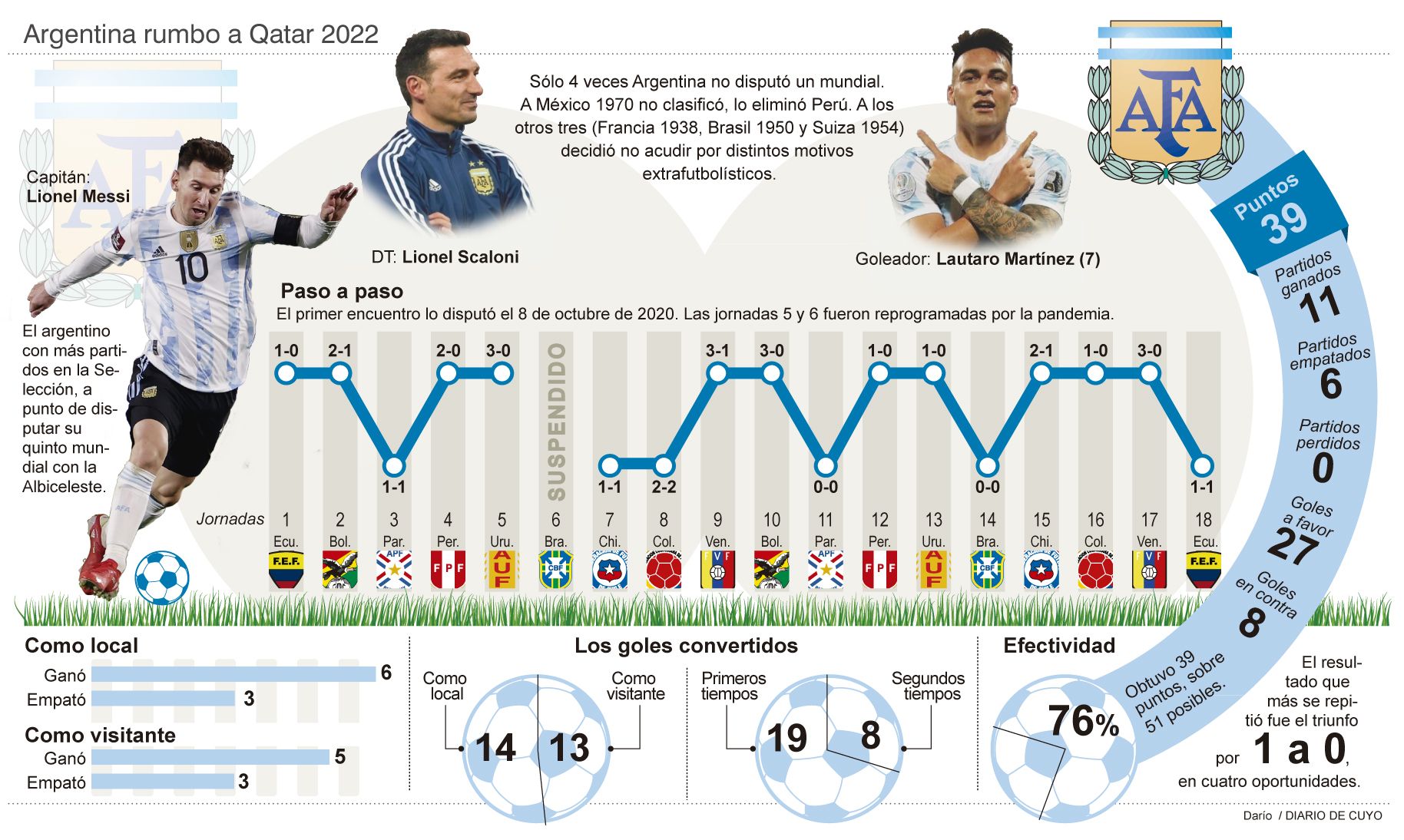 Pasó Ecuador, pasó la fecha final y Argentina intacta. Invicta, sólida y ganadora volvió a demostrar su madurez como equipo para terminar empatando con Ecuador en Guayaquil 1-1, con un gol de Julián Álvarez más el penal de Valencia y cerrar un ciclo en medio de un proceso sanador que apunta a Qatar como el gran objetivo. No fue sencilla la historia en la humedad infernal de Guayaquil porque Ecuador lo apuró, lo presionó pero Argentina tuvo la solvencia para resolverlo con sus argumentos y dejar más que claro que esta previa al Mundial no puede encontrarlo mejor. Un proceso sanador en medio de un ciclo que nació en la urgencia. Una forma de ser como equipo que no sólo sirvió para clasificar cómodo, para meter la Copa América en el medio y para terminar ilusionando a todos como siempre o como nunca. Es que esta selección invicta de Scaloni, con 31 partidos, igualó anoche el récord de una Mayor que ostentaba de manera solitaria el ciclo de Alfio Basile entre 1991 y 1993. Esta selección terminó convenciendo a todos, propios y extraños. Logrando tener al mejor Messi de todos los ciclos del capitán con la camiseta albiceleste, recuperando nombres que parecían ya descartados con un caso paradigmático tal vez: el de Ángel Di María. Pero además, este proceso que empezó como emergencia cuando Argentina ardía tras el fracaso de Rusia 2018, terminó generando esa renovación que era indispensable pero que nadie se animaba a hacerla, más aún sin la espalda necesaria para bancar ese momento. Pero Scaloni lo asumió.