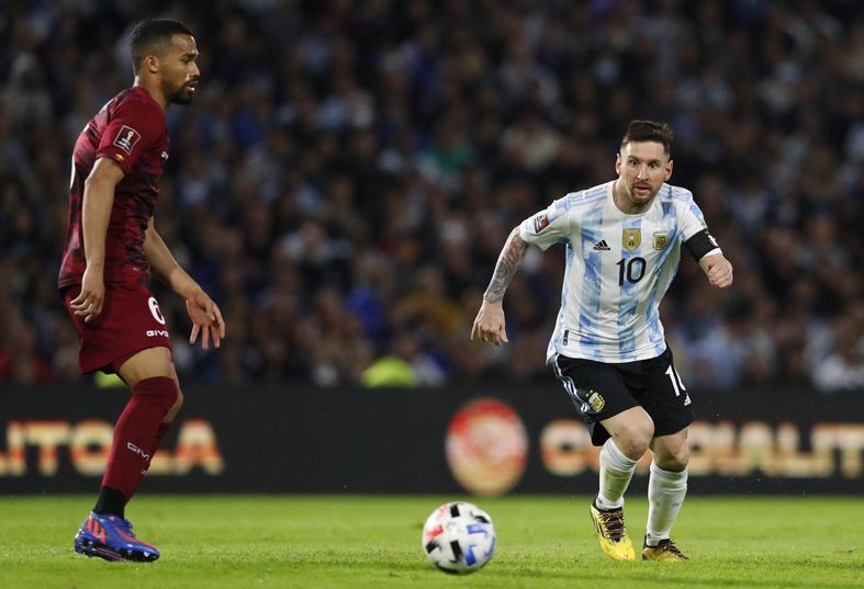 Acecha. Lionel busca quitarle el balón a un rival de Venezuela. La Pulga anotó su 15to tanto en la gestión de Scaloni.