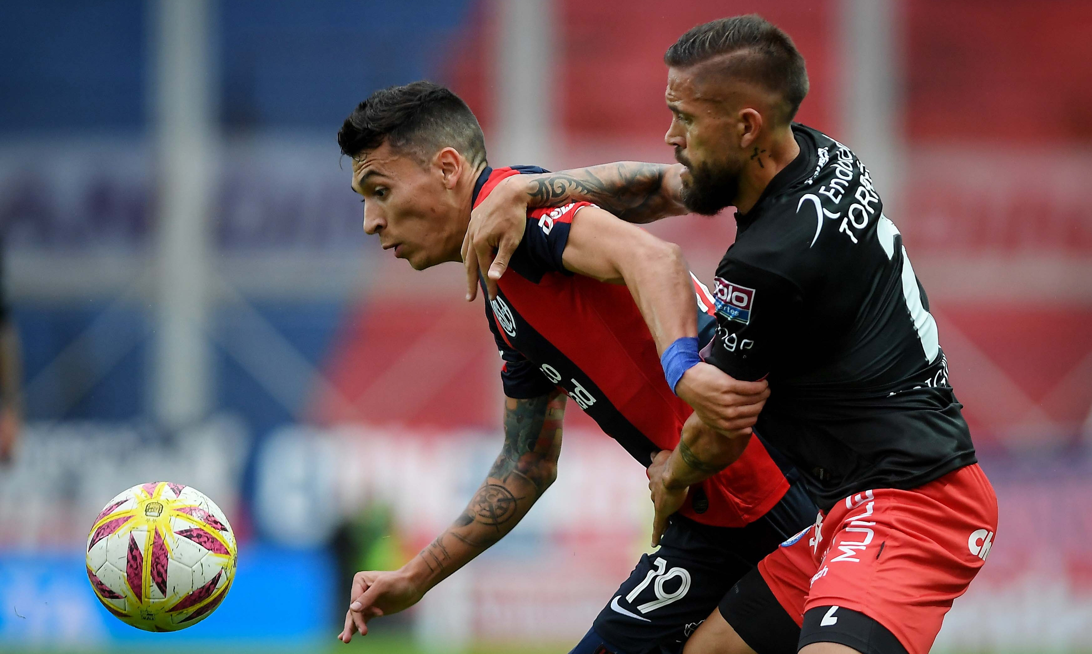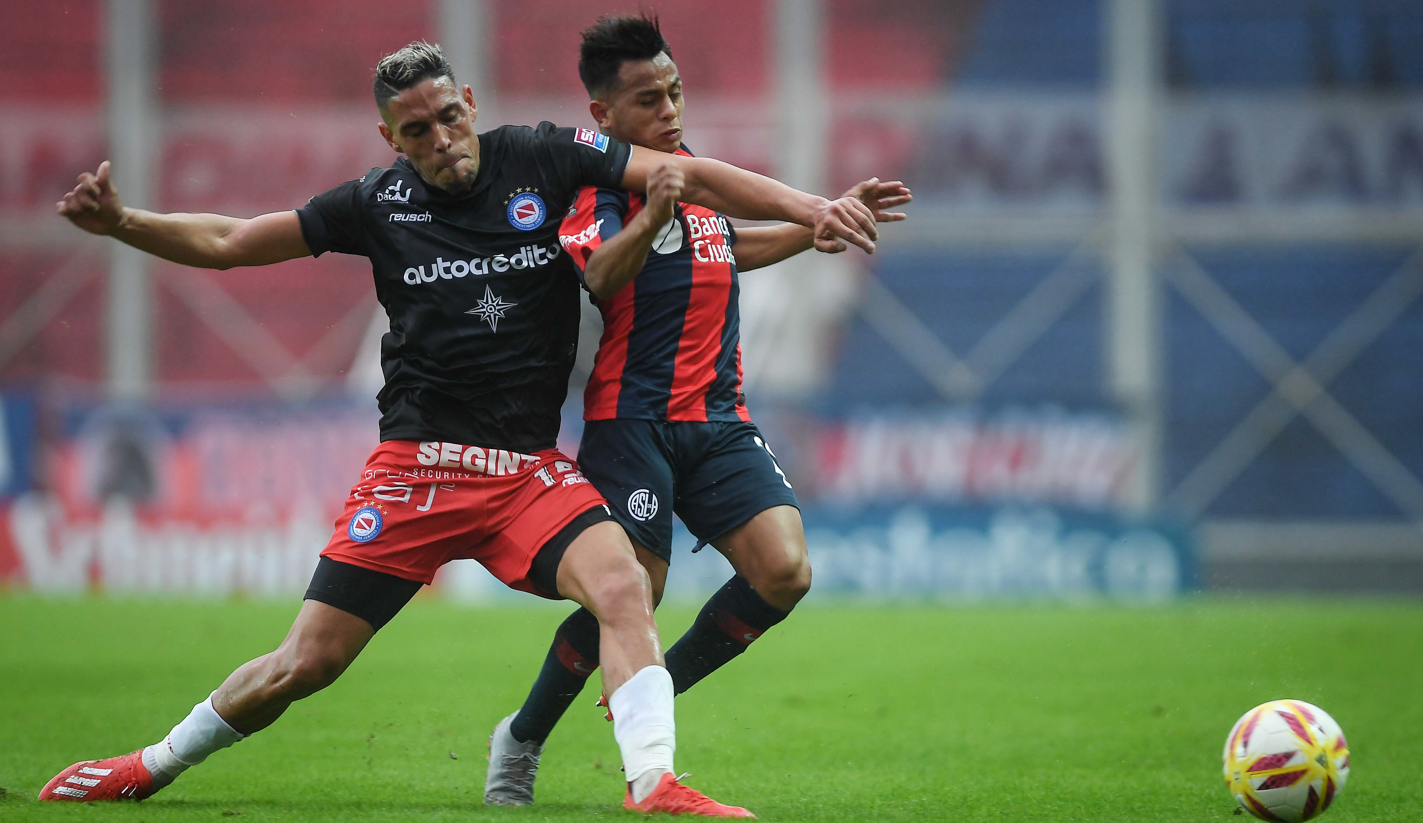 Luchado. Damián Batallini, de Argentinos, y Nahuel Barrios, de San Lorenzo, luchan por la posesión de la pelota. El Bichito de La Paternal pasó a la otra ronda al empatar de visitante y haber ganado de local.