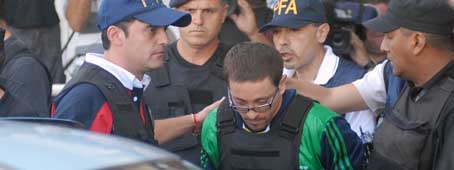 El detenido llegó a las 10.40 en un vuelo de Alitalia y, bajo una fuerte custodia de efectivos de Interpol y del Departamento de Prevención de la Violencia en el Fútbol de la Policía Federal, fue trasladado a los tribunales para ser indagado por el juez de instrucción porteño Luis Rodríguez, a cargo del caso.