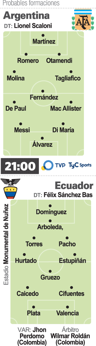 En un Monumental repleto con más de 86 mil espectadores, Lionel Messi y compañía tratarán de seguir en esa "luna de miel" que parecen transitar luego de coronarse en Medio Oriente ante Francia. A las 21 horas, por la TV Pública y TyC Sports, Argentina se mide ante Ecuador, de aceptable labor en el Mundial pasado cuando quedó eliminado en primera fase y era dirigido por el argentino Gustavo Alfaro.