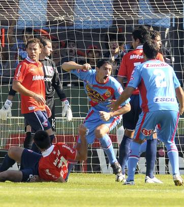 Todo mal le salió a Independiente en el primer tiempo ya que la defensa dio innumerables ventajas. Arsenal, mientras tanto, explotó cada una de las carencias del ‘Rojo‘. A los 9, llegó un centro preciso de Aguirre que Guillermo Burdisso, luego de ganarle muy bien a Leonel Galeano, cabeceó para ubicar la pelota en el ángulo izquierdo. Arsenal pudo haber aumentado a los 19, pero el tiro libre desde la derecha de Leguizamón se estrelló contra el travesaño. El segundo gol, merecido a esa altura, llegó a los 27. Leguizamón eludió sin problemas a Galeano y envió un centro desde la izquierda que Milito desvió contra su valla. Recién ahí pareció reaccionar Independiente, pero tras un par de intentos aislados de Farías y Villafañez, el equipo del Viaducto volvió a golpear a los 41 mediante un frentazo de Zelaya.