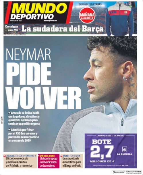 La información trascendió este viernes y sacudió a todo el mundo del deporte. Neymar Jr., según la tapa del prestigioso diario Mundo Deportivo, pidió dejar el PSG para volver a vestir la camiseta del Barcelona.