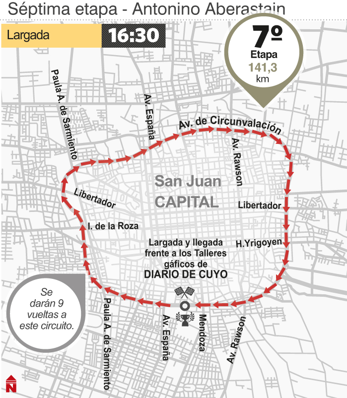 Diario de Cuyo | HOME | Pasión Deportiva | Vuelta a San Juan 2018 | 36ta vuelta a san juan Así es el recorrido del último capítulo La etapa 7, que coronará al gran ganador de la competencia, largará y finalizará en la Circunvalación, frente a los talleres gráficos de DIARIO DE CUYO. Por Redacción Diario de Cuyo 27/01/2018 · 0:00 Vuelta a San Juan 2018 Ver los comentarios ›