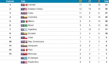 Diario de Cuyo | HOME | Pasión Deportiva | Uno por uno Así está el medallero Los Panamericanos comenzaron el sábado y Argentina ya 17 preseas. El líder es Canadá con 41. Mirá la tabla completa. Por Redacción Diario de Cuyo 14/07/2015 · 0:00 Así está el medallero en este momento. Ver los comentarios ›