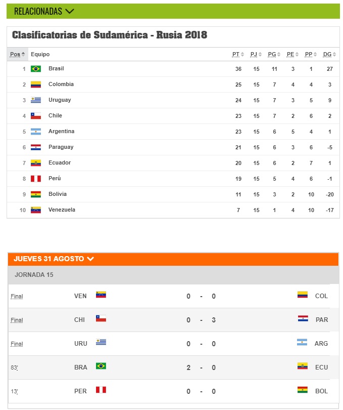 Paraguay sorprendió a los trasandinos con un sólido 3-0 en Santiago y le dio una mano a la Albiceleste (23 unidades), que también logró descontarle un punto a Colombia (0-0 ante Venezuela) y quedó a dos. Sin embargo, a los guaraníes no hay que perderlos de vista ya que suman 21.
