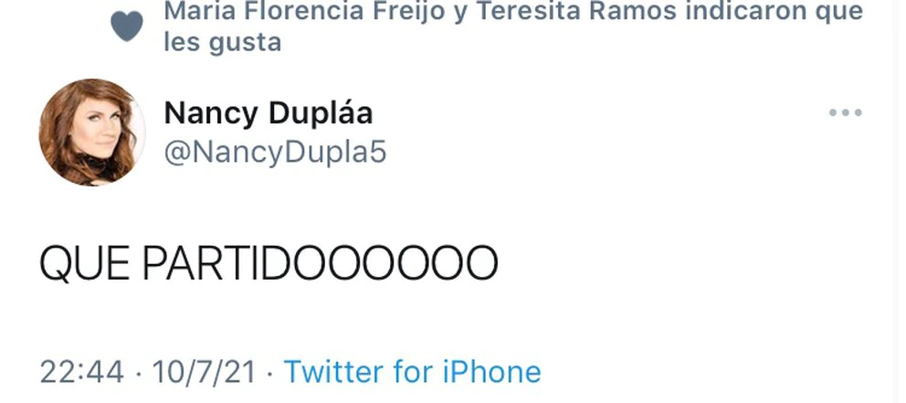 Y con el avance de los minutos, cuando la gloria parecía estar más cerca, Nancy Dupláa tuiteó: “Qué partidooooo”. Mientras Florencia Peña, que en todo el partido se manifestó sin pausa, apuntó: “No estoy en pedo. Para nada”, y acompañó su tuit con un emoticon de “carita tapada”. Y claro que cuando terminó el partido, Peña fue la primera en poner: “En tu cara Bolsonaro”.