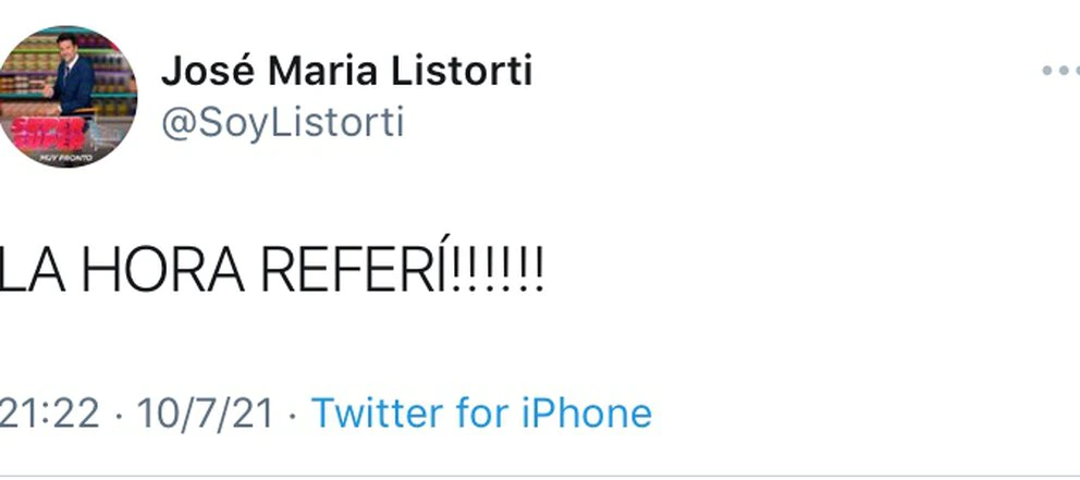 “La hora, referí”, tuiteó José María Listorti a las 21.22 de la noche, un minuto después de que Ángel Di María anotara el primer gol de la Selección Argentina frente a Brasil, en la final de la Copa América disputada en el mítico estadio Maracaná de Río de Janeiro.