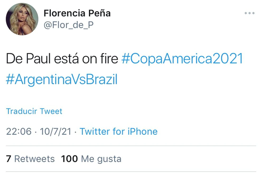 De arranque en el segundo tiempo, Florencia Peña que suele ser una fiel seguidora de la Selección Argentina, escribió una observación: “De Paul está on fire” y agregó el hashtag del partido que paralizó esta noche el corazón de los argentinos. Actriz comprometida, en las semifinales contra Colombia la conductora de Flor de equipo también había estado activa en redes sociales.
