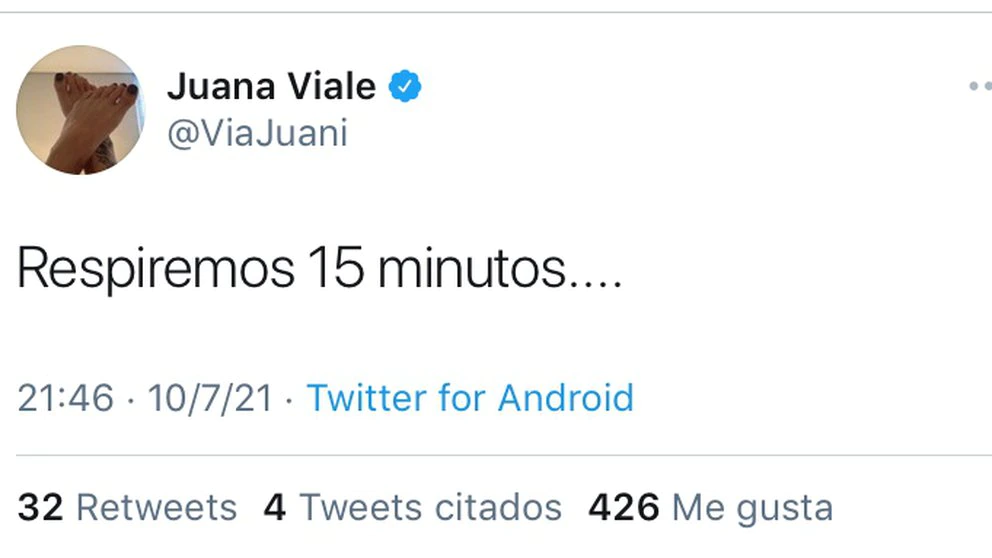 Y para ir al entretiempo, otra dama que suele manifestarse en cuestiones de fútbol y que viene de una familia amante del deporte de la pelota redonda, Juana Viale, exclamó: “Respiremos 15 minutos…”.
