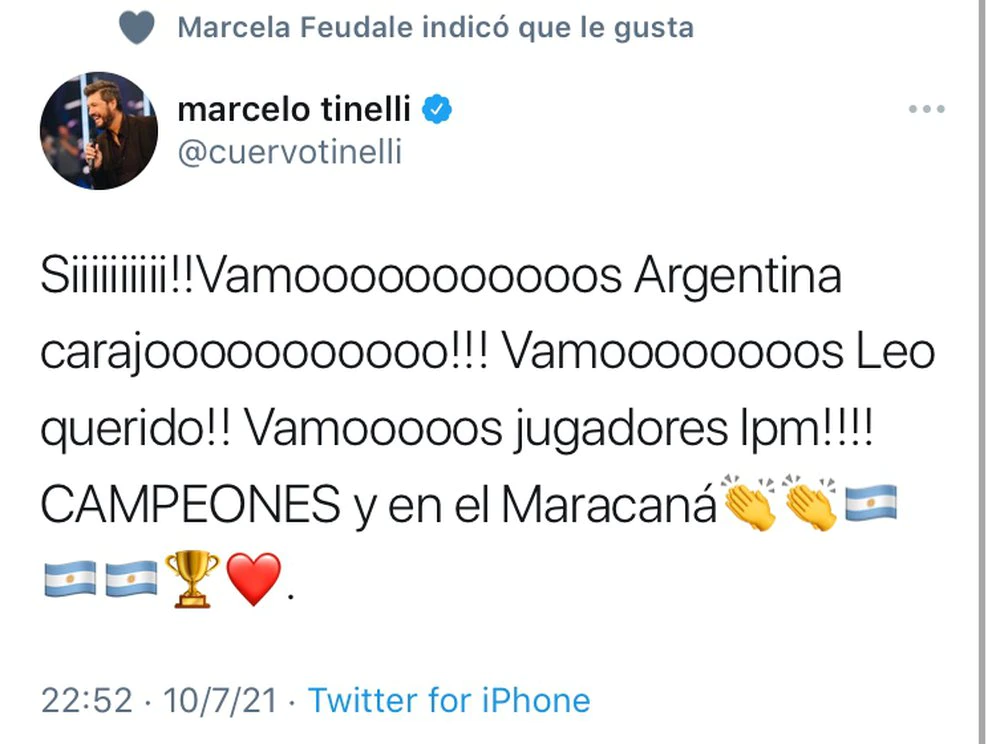 Tras el pitazo final, el primero en manifestarse fue un fiel seguidor –y defensor hasta en los momentos más cuestionados– de la Selección Nacional, Marcelo Tinelli. “Siiiii Vamooooooos Argentina carajoooooooo!!! Vamoooooooos Leo querido!!! Vamos jugadores lpm!!! CAMPEONES y en el Maracaná”, escribió con aplausos, una copa, un corazón y la bandera albiceleste en emoticones.