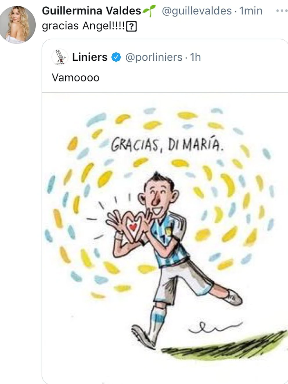 Claro que a Tinelli lo acompañó su esposa, Guillermina Valdes, que eligió repostear a Liniers para agradecerle a Ángel Di María, autor del gol de la victoria. “Gracias Ángel!!!”, escribió sobre la ilustración del maestro que tenía un “Vamooooo” como insignia. Claro que a esa altura, Florencia Peña apuntó: “Salimos campeones en el Maracaná!!! Estoy llorando!!! Vamooo Argentina. Carajoooooo!!!”.