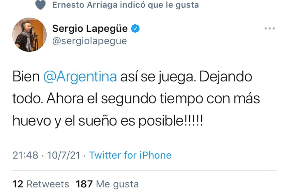Su colega en televisión, aunque más bien ligado al noticiero, Sergio Lapegüe se desahogó con un análisis contundente cuando empezaba el complemento. “Bien Argentina. Así se juega. Dejando todo. Ahora el segundo tiempo con más huevo y el sueño es posible!!!!!”, apuntó el periodista de ElTrece y TN.
