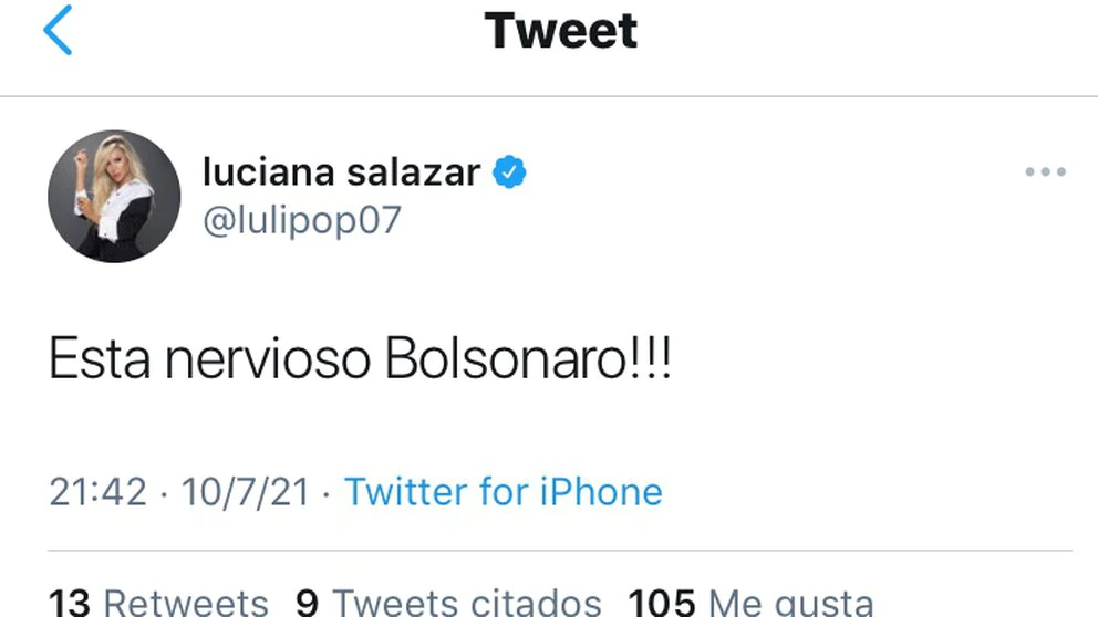 “Está nervioso Bolsonaro!!!”, apuntó Luciana Salazar, también desde Twitter para hacer referencia al presidente brasileño y fiel a su costumbre de hacer afirmaciones de índole política desde la red social.
