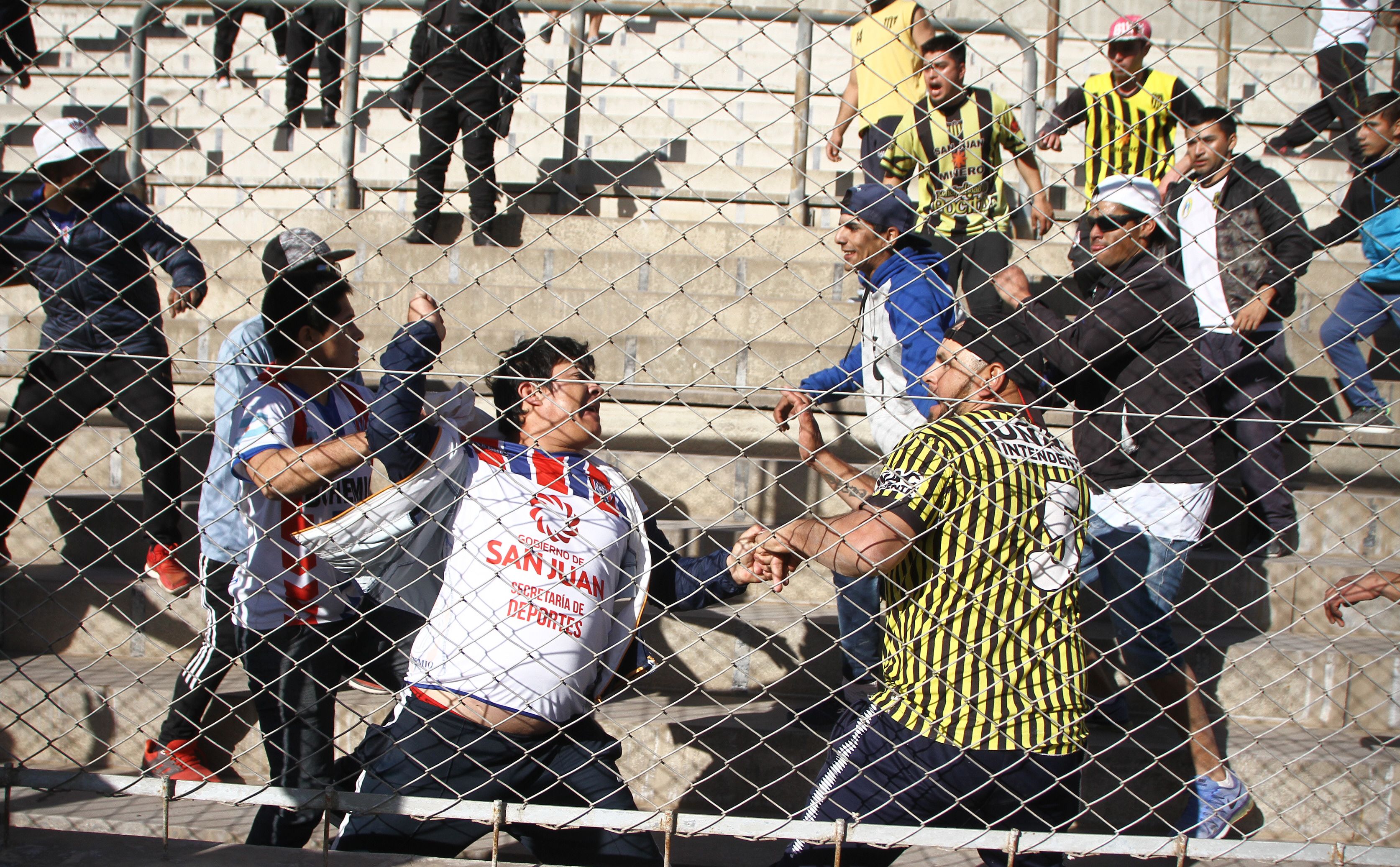 Iban apenas 10" de partido y la estupidez volvió a copar la escena. En esta pelea por tener dos públicos, otra vez casi gana la barbarie porque no menos de 20 hinchas entre las dos parcialidades decidieron agredirse en la Platea Este y ante la pasividad policial que poco hizo para prevenir estos incidentes. Tan poco fue el accionar policial que la gresca se sofocó casi sola. Increíble que habiendo no más de 200 hinchas en cada cabecera, un operativo policial no pueda contenerlos ni prevenir incidentes como los que se vieron. Una postal para amargarse.