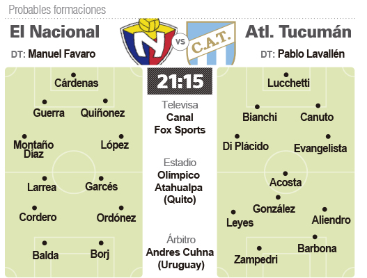 Atlético Tucumán visitará hoy a El Nacional de Ecuador, con la necesidad de conseguir un triunfo o una igualdad por tres goles para acceder de manera directa a la siguiente ronda, tras el empate 2-2 del encuentro de ida de una de serie de la segunda fase de la Copa Libertadores de América.