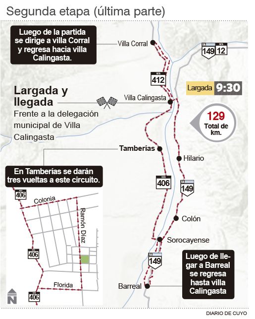 Hoy desde las 9:30 comenzará a escribirse el último acto de la Doble Calingasta 2018/19. Se completará la etapa iniciada ayer. Gran parte del trayecto será el mismo recorrido en su primer segmento, pero se agregarán dos trayectos. Se largará en la villa de Calingasta para luego transitar al Norte hasta Villa Corral, en esos, casi 25 kilómetros (ida y vuelta) el viento suele ser un invitado de piedra. Desde 2003 no se transita por esa ruta. En aquella ocasión los ciclistas sufrieron el castigo permanente del viento. Después el pelotón pondrá proa al Sur y luego de atravesar la villa y cruzar Tamberías, irá hasta Barreal. Luego de un giro por el pintoresco distrito volverá a Calingasta pasando por Sorocayense, La Isla e Hilario. Serán 120 kilómetros que prometen ser interesantes.