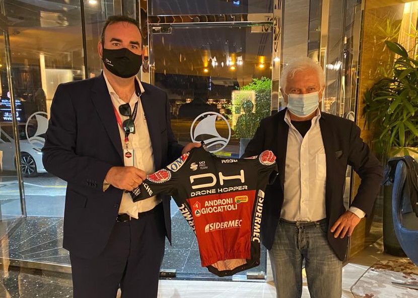 El director del Androni, junto a Pablo Flores, propietario Drone Hopper, nuevo sponsor principal de equipo, con quien había previsto viajar a San Juan.