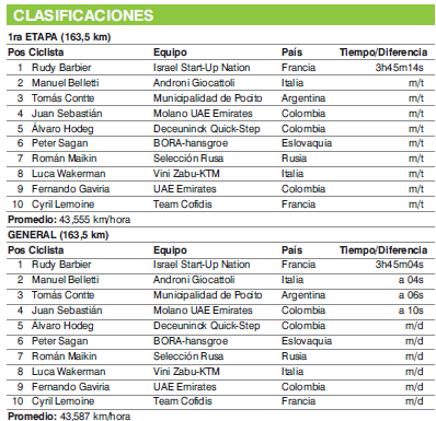 Al sprint con un pelotón más flaco lo armaron los hombres del Androni, a su derecha se formó el tren del BORA y a la izquierda cerraron filas los del Deceuninck Quick Step y no dejaron entrar a los hombres del UAE, Maximiliano Richeze, Juan Sebastián Molano y Fernado Gaviria quedaron encajonados y se les complicó su labor. Barbier que buscó por la cuerda exterior superó a Manuel Belletti (Androni) a 20 metros de la meta. Tercero llegó Tomás Contte (Mun. de Pocito) que no sólo fue el mejor argentino clasificado, también se quedó con la malla del mejor ciclista de la categoría sub-23.
