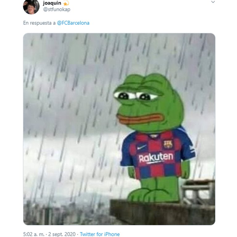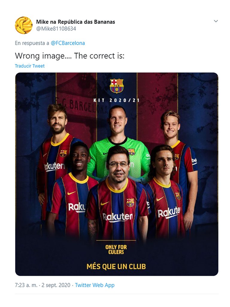 La publicación sobre la equipación en donde se ve al argentino y a varios de sus compañeros (o ex compañeros) con la nueva camiseta, no pasó desapercibida en las redes sociales. Cientos de usuarios comentaron el tuit con mensajes de burla y enojo. Algunos optaron por tapar la cara de Messi con la de Bartomeu, mientras que otros lo vistieron con la indumentaria del Manchester City, el cual parece que será su destino.