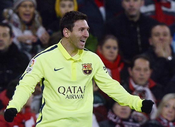 Barcelona goleó como visitante al Athletic de Bilbao por 5-2, con dos anotaciones del argentino Lionel Messi, del uruguayo Luis Suárez y el brasileño Neymar, resultado que le permite seguir al acecho del líder Real Madrid. Con la quinta victoria consecutiva en la Liga, Barcelona llegó a 53 puntos, para ponerse a uno del líder Real Madrid, que el sábado fue goleado 4-0 por el Atlético de Madrid, que registra 50 unidades. En el partido que cerró la jornada 22 del campeonato español, los azulgranas abrieron el marcador a los 15 minutos del partido disputado en el estadio San Mamés, con un disparo de Messi desde fuera del área que se le escapó al portero Gorka Iraizoz después de que el balón fuera desviado por la barrera. Suarez estuvo cerca de aumentar la ventaja a los 20 minutos con un remate de cabeza a bocajarro que Iraizoz desvió en la línea de gol. Pero cinco minutos después, el delantero uruguayo registró su gol con un disparo desde fuera del área tras recibir un pase de Messi y después todo se le hizo más fácil. En los otros partidos, Almería, Getafe y Valencia ganaron 2-1 a Córdoba, Sevilla y Espanyol, respectivamente. El sábado había caído Real Madrid ante el Atlético por 4-0.