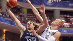 Sin embargo, no pudo sostener ese rendimiento, bajó su solidez defensiva y alemania le hizo pesar la altura de sus hombres (dominó los rebotes en esa mitad 18-11), sobre todo del juvenil Pleiss (11 puntos) para remontar la desventaja y con un triple sobre la chicharra se fue al descanso largo ganando 42-39, ante un equipo argentino que sintió el impacto.