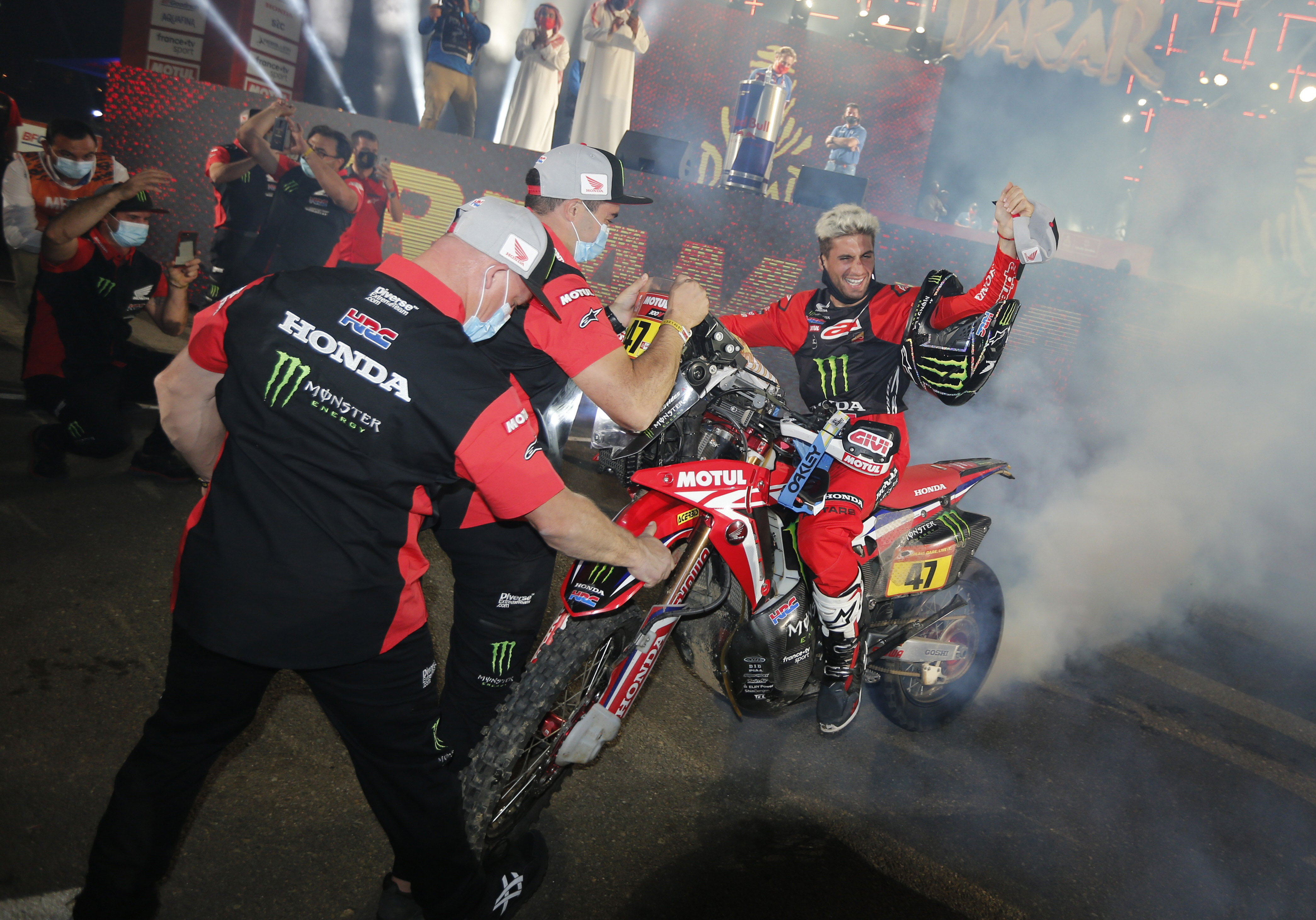 El salteño Benavides (Honda) puso ayer a la Argentina y a Sudamérica por primera vez en lo más alto de la categoría de motos dentro del Dakar, al consagrarse en la edición 2021, ya que le alcanzó con el segundo puesto en la etapa de la víspera, detrás del estadounidense Ricki Brabec (Honda).